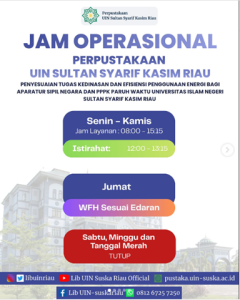 Halo Pemustaka! Menindaklanjuti Edaran Rektor mengenai Penyesuaian Tugas Kedinasan dan Efisiensi Energi, ada perubahan jadwal layanan di Perpustakaan UIN Sultan Syarif Kasim Riau nih:
